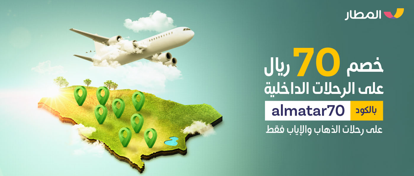 وفر 70 ريال على أي حجز طيران داخلي ذهاب واياب فقط باستخدام الكود "almatar70"