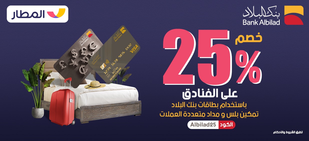 خصم %25 على حجوزات الفنادق لحاملي بطاقات تمكين بلس ومداد متعددة العملات من بنك البلاد باستخدام الكود “Albilad25”