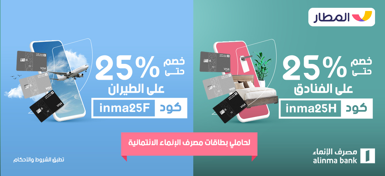 خصم مباشر 25% على حجوزات الباقات لحاملي بطاقات مصرف الإنماء الائتمانية باستخدام الكود “inma25P”