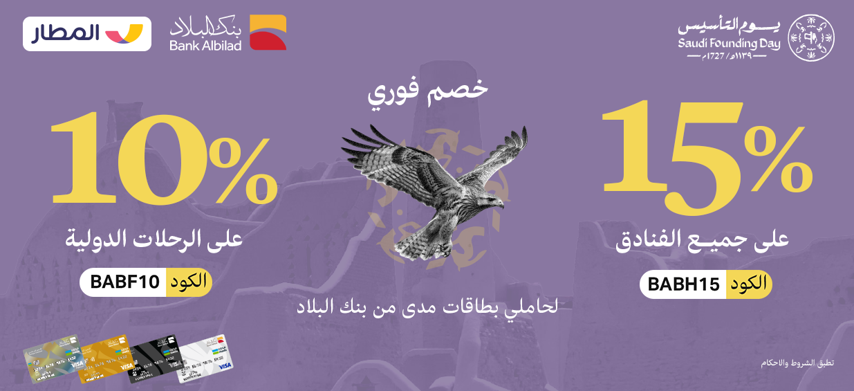 خصم مباشر 15% على حجوزات الفنادق الدولية والمحلية لجميع حاملي بطاقات مدى لدى بنك البلاد باستخدام الكود “BABH15”