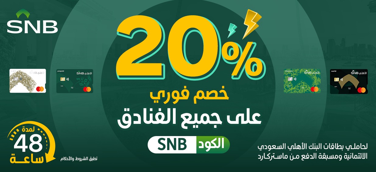خصم مباشر %20 على جميع حجوزات الفنادق لجميع حاملي بطاقات البنك الأهلي السعودي الائتمانية ومسبقة الدفع من ماستركارد باستخدام الكود “SNB”