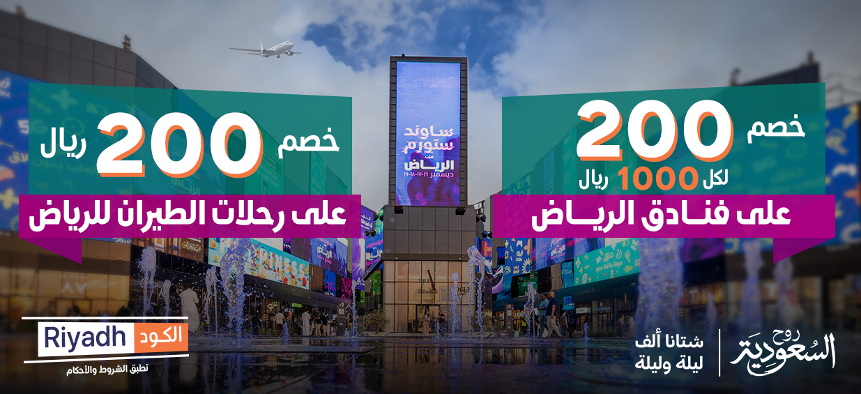 - خصم 200 ريال (100 خصم مباشر + 100 كاش باك) في محفظة العميل لأي رحلة داخلية إلى الرياض باستخدام الكود Riyadh