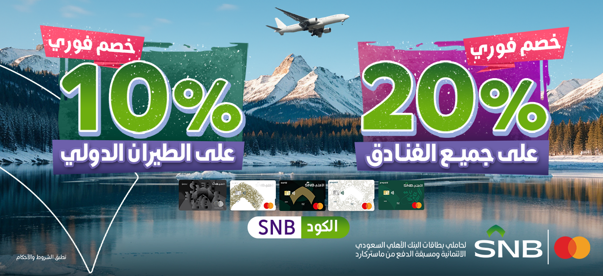 خصم مباشر %10 على حجوزات الطيران الدولي لجميع حاملي بطاقات البنك الأهلي السعودي الائتمانية ومسبقة الدفع من ماستركارد باستخدام الكود “SNB”