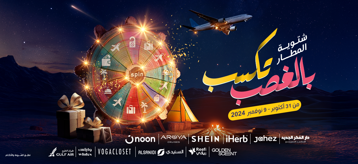 - عجلة الحظ موجودة فقط داخل تطبيق المطار ولا يوجد عجلة حظ في الموقع.