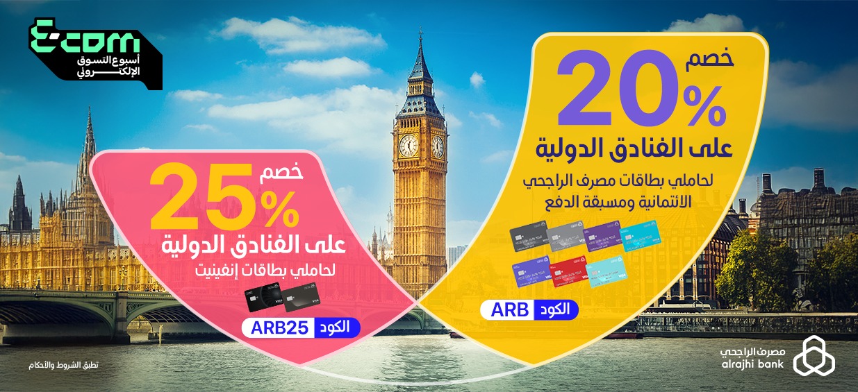 خصم مباشر %20 على جميع حجوزات الفنادق الدولية لحاملي البطاقات الائتمانية ومسبقة الدفع من مصرف الراجحي باستخدام كود ARB”"