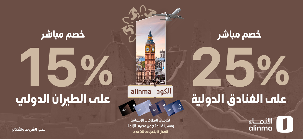 خصم 15% على حجوزات الطيران الدولية لحاملي بطاقات مصرف الإنماء الائتمانية ومسبقة الدفع باستخدام الكود “alinma”