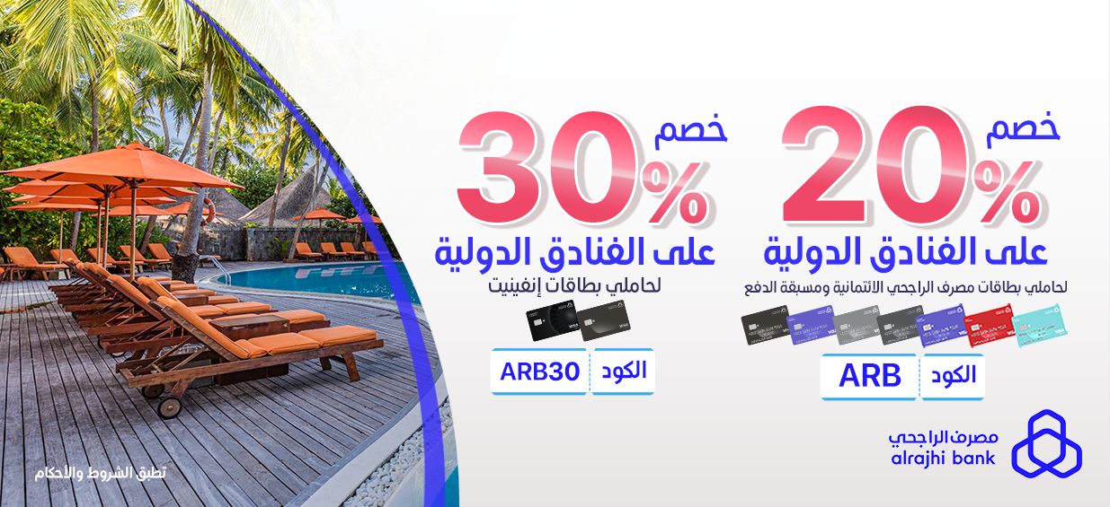 خصم مباشر %30 على جميع حجوزات الفنادق الدولية لحاملي بطاقات إنفينيت من مصرف الراجحي باستخدام كود "”ARB30