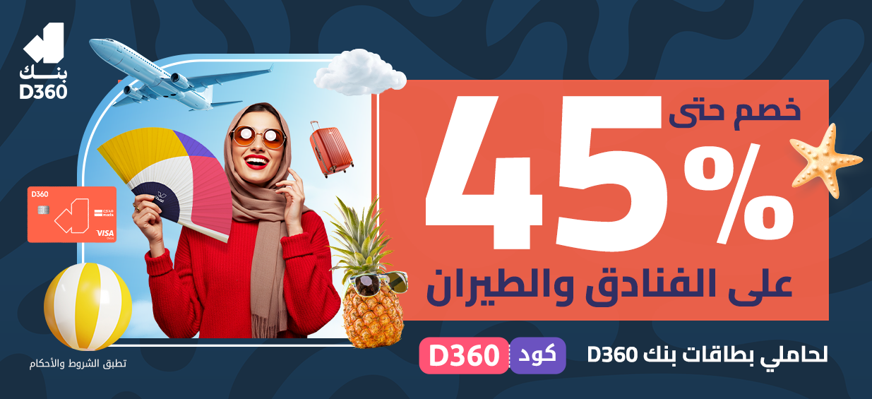 خصم يصل حتى 15% (5% خصم مباشر + 10% كاش باك كنقاط في المحفظة) على جميع حجوزات الطيران لحاملي بطاقات بنك D360 باستخدام الكود “D360”