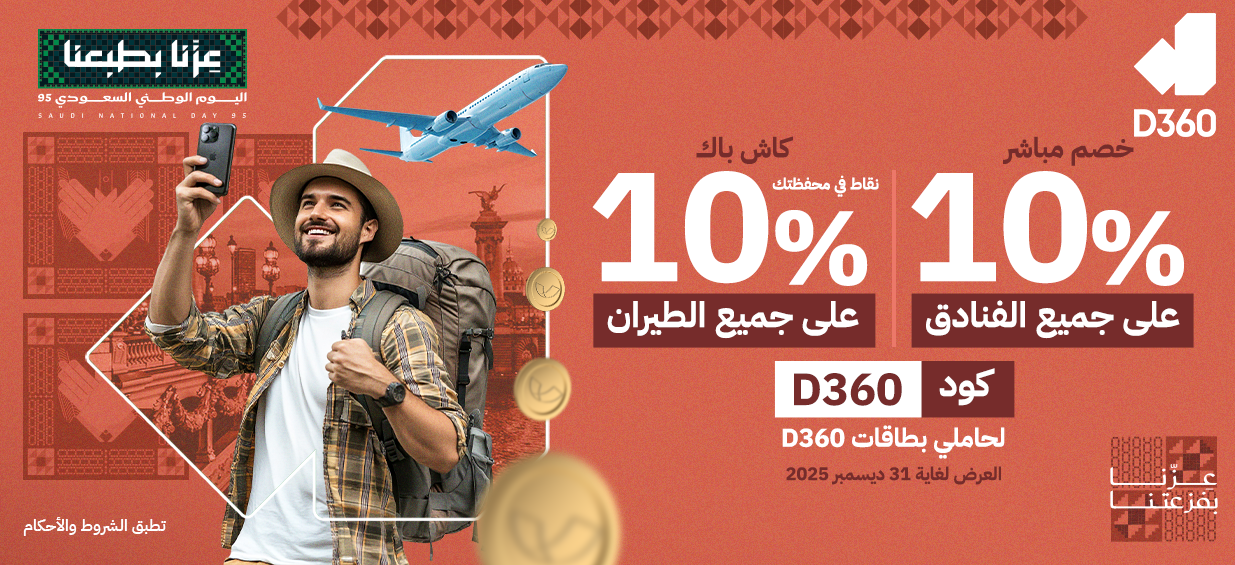 10% كاش باك كنقاط في المحفظة على جميع حجوزات الطيران لحاملي بطاقات بنك D360 باستخدام الكود “D360”