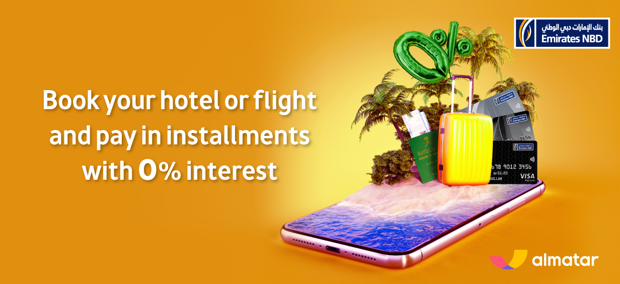 Book your hotel Or flight and pay in installments with 0% interest using Emirates NBD credit cards.