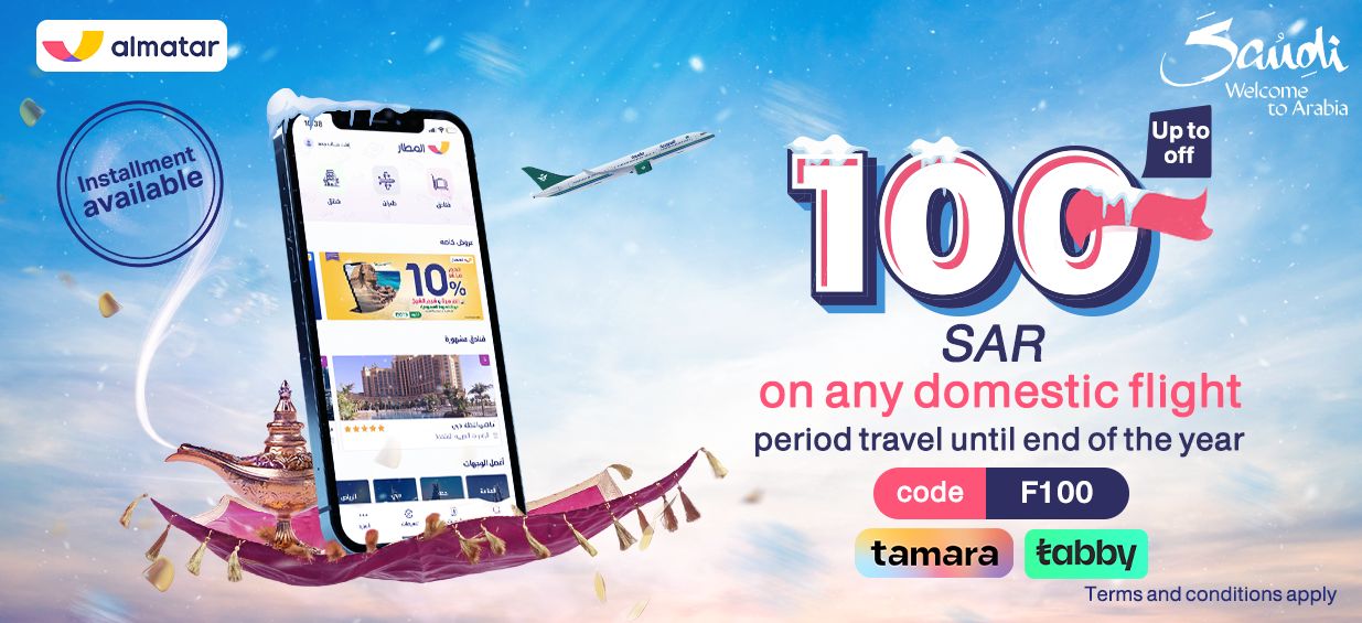 Get Up to 100 SAR on every domestic flight ticket (50 cash back as points in customer wallet+ 50 SAR Off) Using Code F100