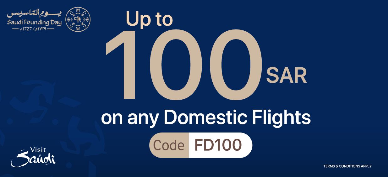 100 SAR off (50 instant + 50 cashback as points in customer wallet) on every domestic flight using code FD100.