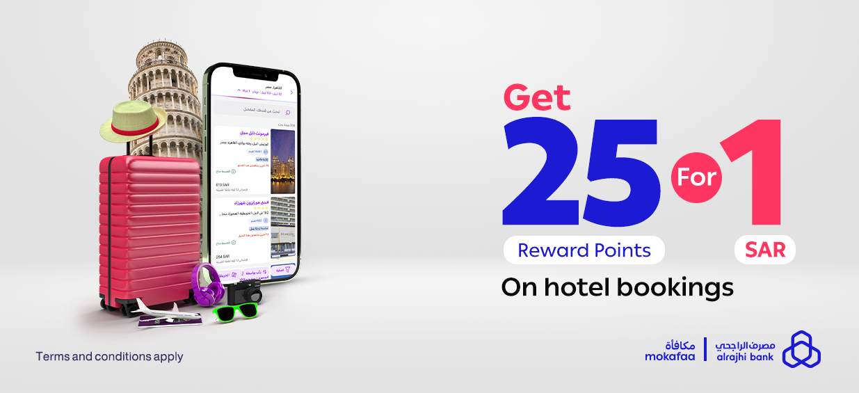 Get 25 Mokafa'a rewards points on every 1 SAR spend on hotels