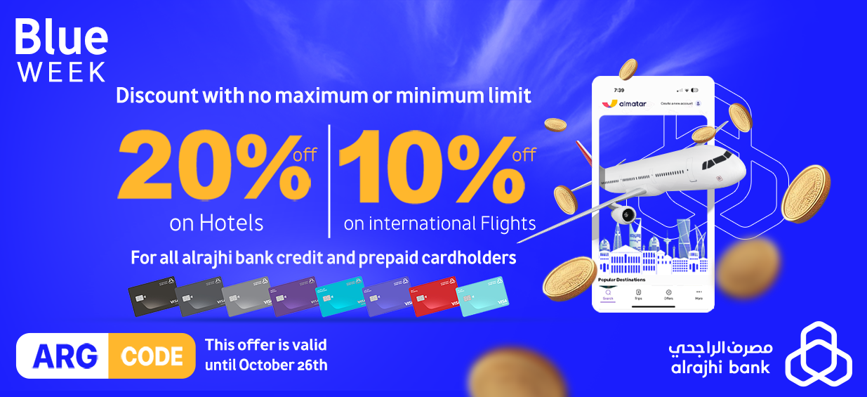 Get 10% direct discount on international flight reservations for all Alrajhi Bank credit or prepaid cardholders using code " ARG”.