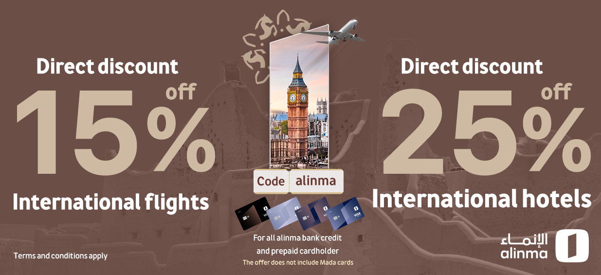 15% direct discount on international flights for Alinma credit and Prepaid Cardholders using code "alinma”.