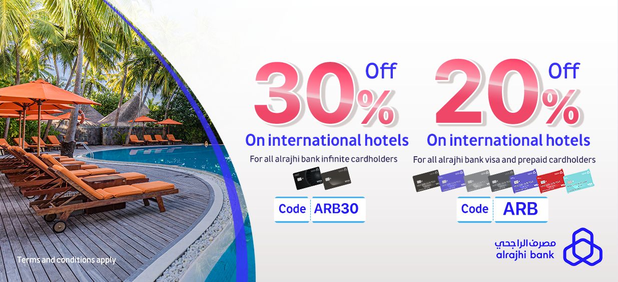 30% direct discount on international hotel reservations only for Infinite cards from alrajhi bank using code “ARB30”.