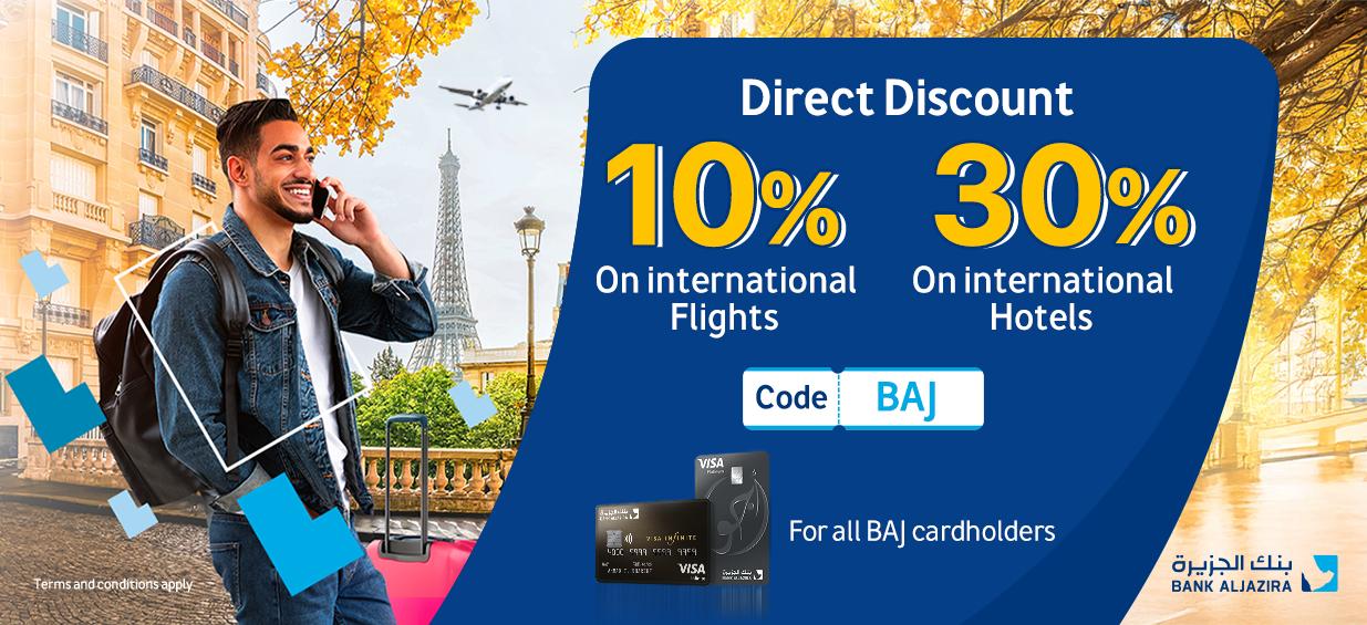 30% direct discount on international hotels for all BAJ credit cardholders using code "BAJ ”.