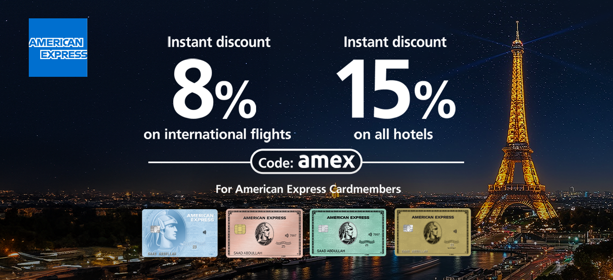 Get 8% direct discount on international flight reservations for Amex cardholders using code " AMEX”.