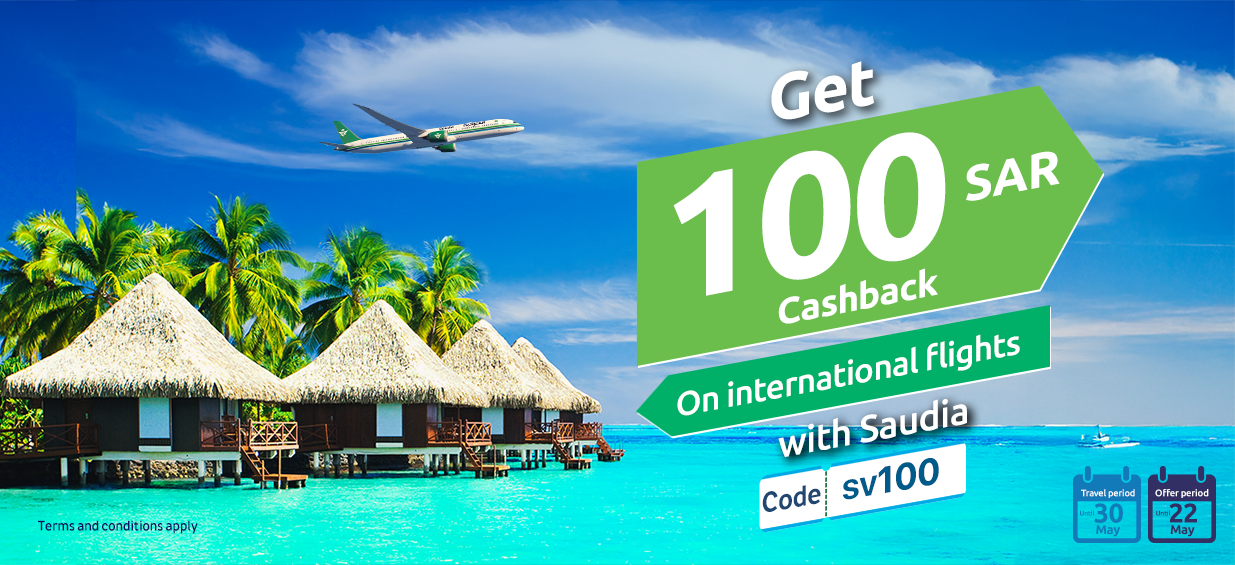 Get 100 SAR cashback if a customer book international flights with Saudia using code (SV100)