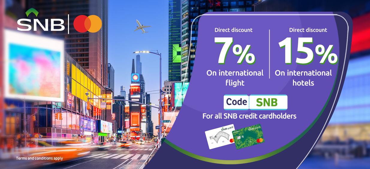 15% direct discount on international hotel reservations for SNB credit cardholders from Mastercard using code "SNB”.