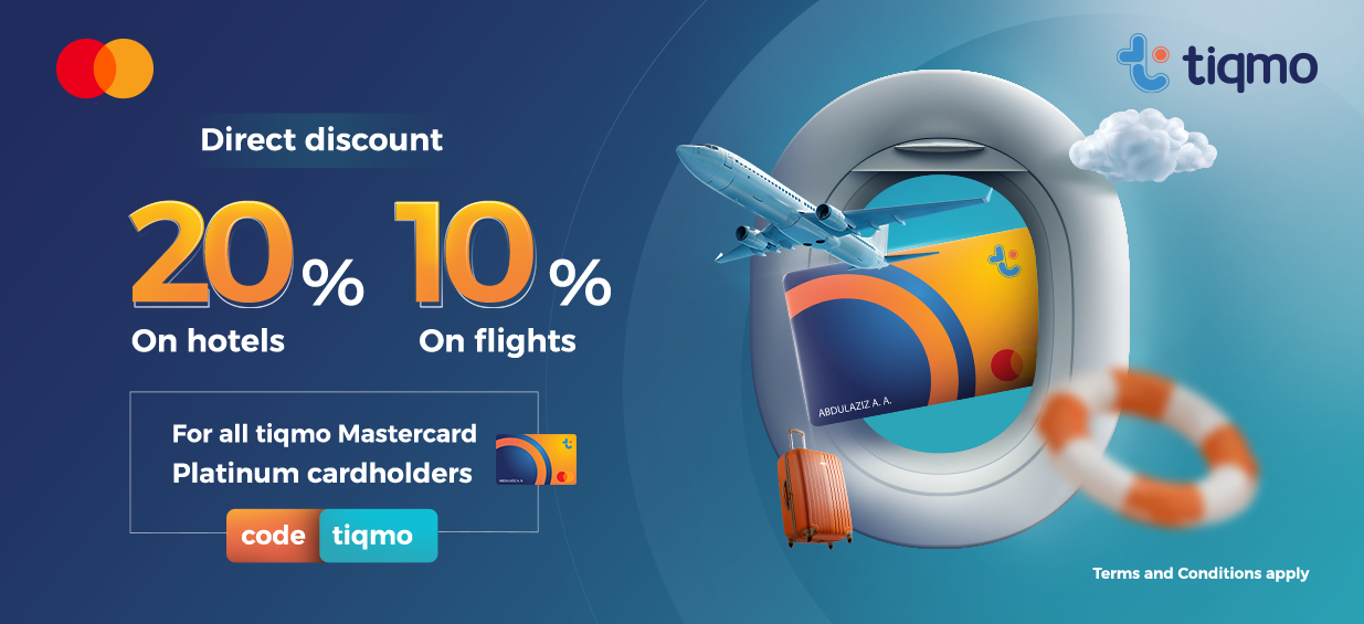 10% direct discount on all flight reservations for tiqmo Platinum Mastercard card cardholders using code " tiqmo”.