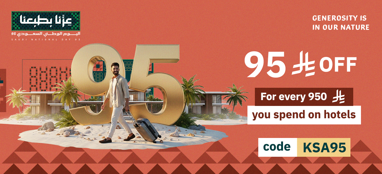Get SAR 95 instant discount on every SAR 950 you spend on all hotel bookings using the code KSA95.