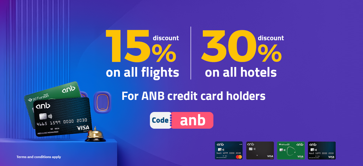 15% off (10% instant discount + 5% Cashback as points in customer wallet) on all flight reservations for all ANB credit cardholders using code ANB.