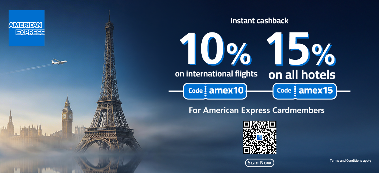 Get 10% cashback as points on your wallet on all flight reservations for for all Amex cardholders using code AMEX10